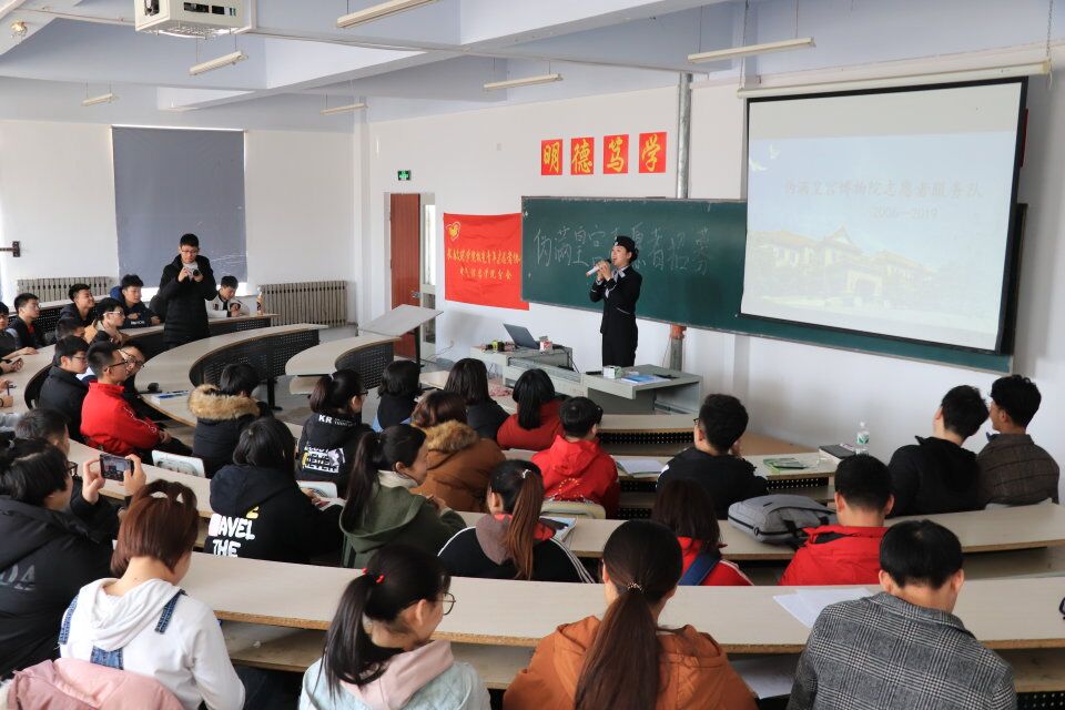 长春建筑学院极光青年志愿者协会电气信息学院分会于201931512时在电气201教室举办了一场为伪满皇宫选拔义务讲解员见面会,此次见面会由伪满皇宫宣讲员刘海冰主讲,电气信息学院团委书记、青协会长马兴宇及60名学生志愿者参加了此次活动。