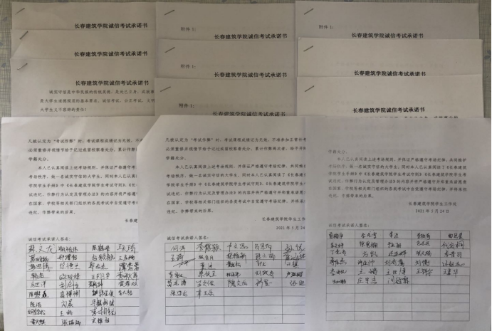 首先,辅导员通过“诚信考试教育”使同学们充分认识到诚信考试的重要性,让同学们真正明确作弊是对自己能力的否认和蔑视,作弊者不仅丢掉了自己的诚信,更丢掉了自己做人的尊严。而后,辅导员鼓励同学们努力学习,尽全力考出自己的水平,去体验获得知识的快乐,并以此宣扬伟大的中华民族传统美德。最后,同学们积极地在《诚信承诺书》上签字,表明了对诚信考试的决心和信心。