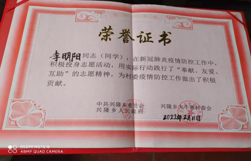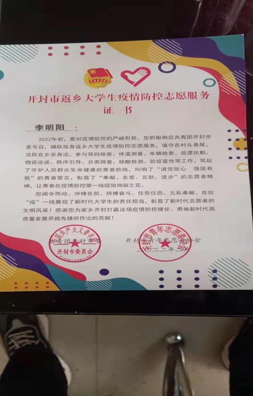 李明阳,长春建筑学院电气信息学院计算机科学与技术专业2102班学生。自河南疫情开始,开封市积极开展防护疫情措施,他于2022年1月15日开始投入到河南省开封市祥符区大牛寨村委会疫情防控志愿者工作中,负责对外来地区人员的排查和登记,特别对郑州等风险地区的群众的14天监控等工作。