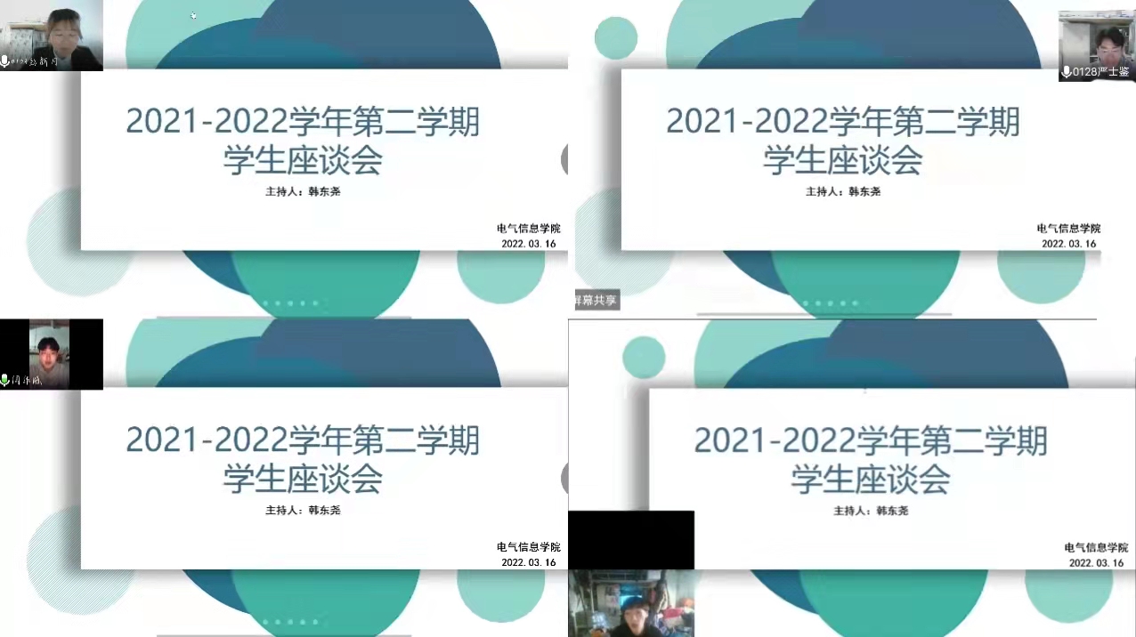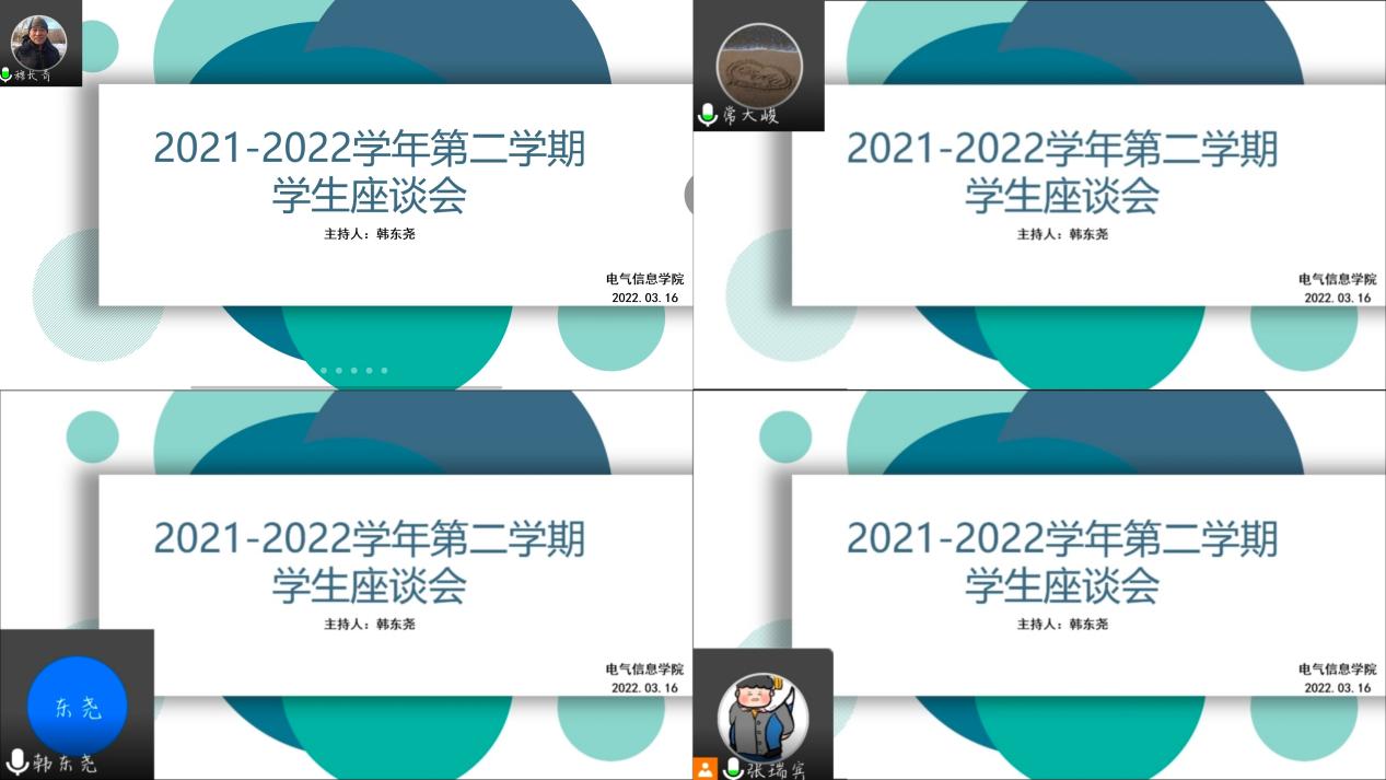 为全面了解学生线上学习及老师授课情况,2022年3月16日16时30分,长春建筑学院电气信息学院组织召开了2021-2022学年第二期线上学生座谈会,会议由教学秘书韩东尧主持。党总支书记穆长青、教学副院长常大俊,及20级、21级所有班级学委和学习部成员参加了会议。