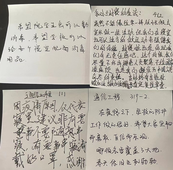 小贴纸上不仅表达了同学们的生活需求与抗疫建议,同时还体现出同学们对抗疫志愿者的信任、理解与支持。疫情尚未结束,抗疫仍在继续。希望同学们始终保持积极乐观的心理状态,同心抗疫、共渡难关。