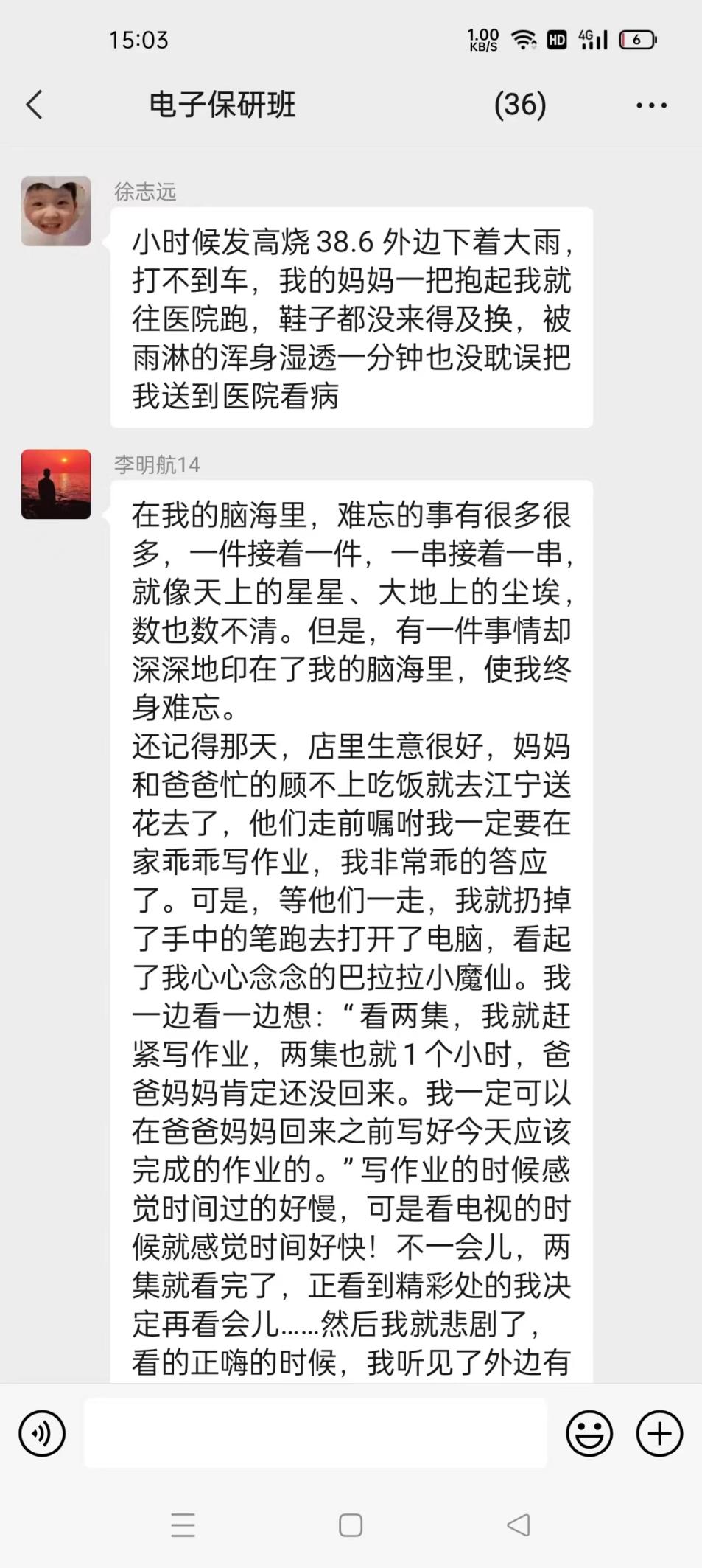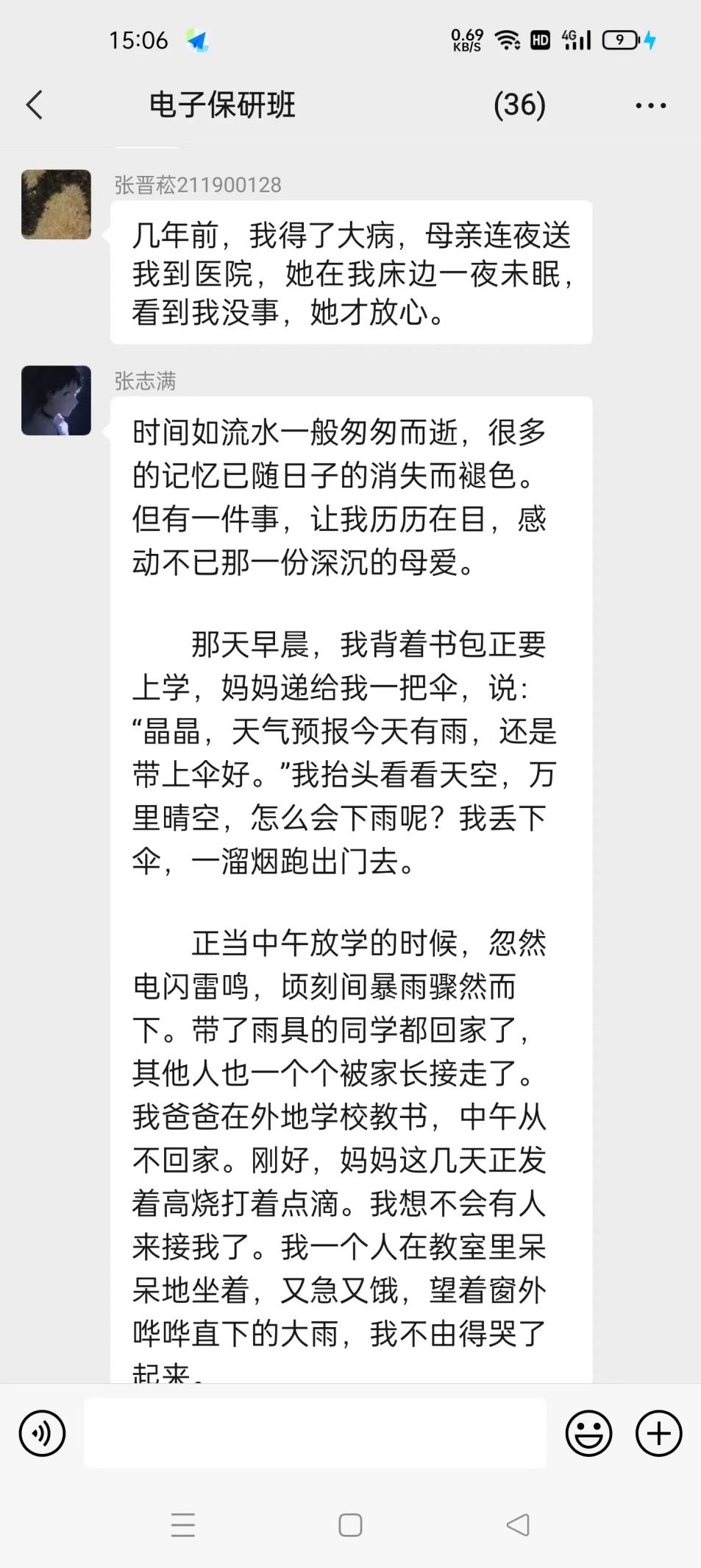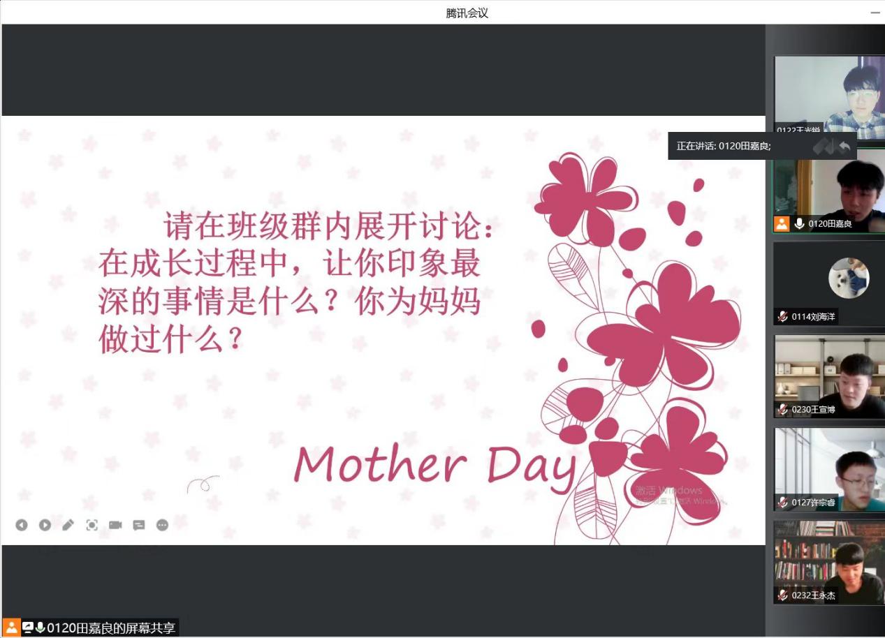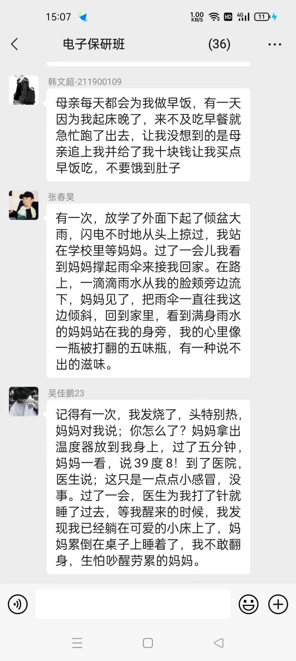 班会伊始,各班团支书利用PPT向同学们详细介绍母亲节的来历,使同学们深切认知母亲节的重要性,让同学们理解母爱的伟大。随后,各班团支书组织同学们在班级群内讨论“在成长过程中,让你印象最深的一件事是什么?你为妈妈做过什么?”这一话题。同学们纷纷在班级群内分享自己的经历,表达对母亲的感恩与敬爱。