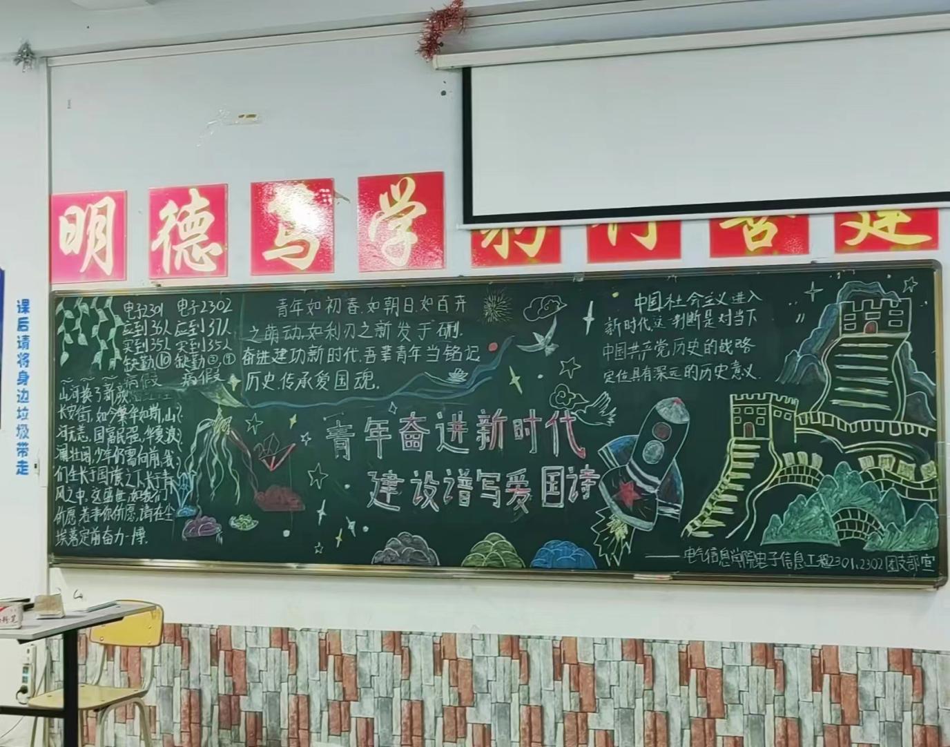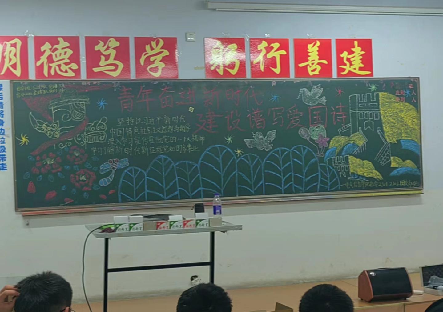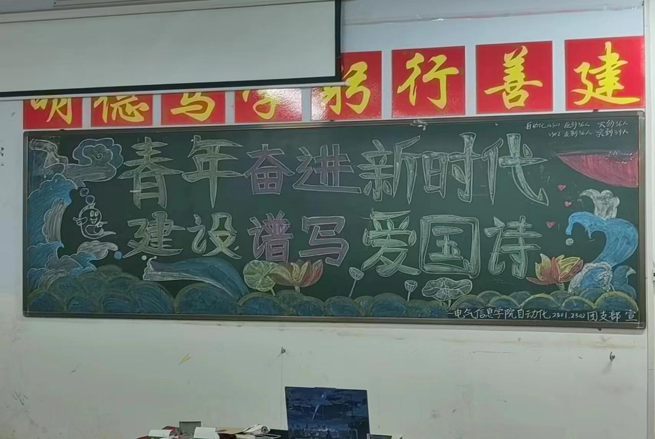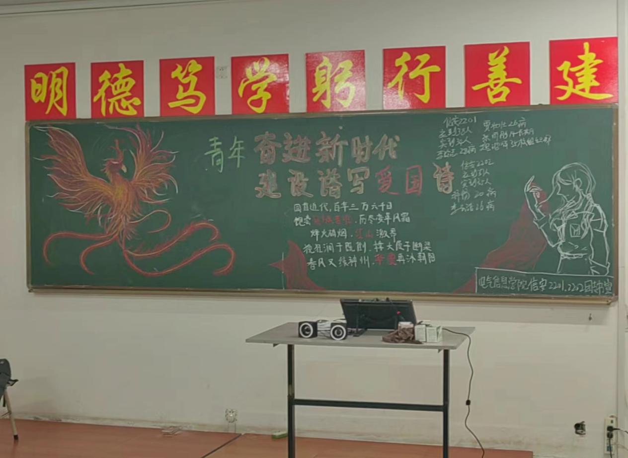 为展现新时代青年的奋斗意志,充分发挥黑板报阵地的育人作用。2023年11月9日19时长春建筑学院电气信息学院开展以“青年奋进新时代,建设谱写爱国诗”为主题的第三期团会黑板报评比活动,22、23级全体班级参加本次评比。