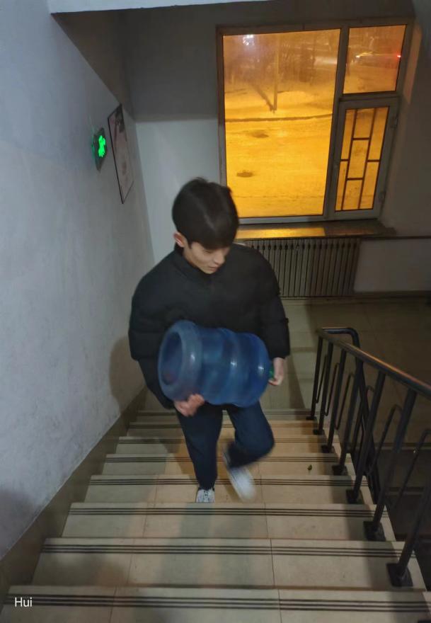下午5:00,志愿者们准时到达指定地点,刘春雨根据女生寝室的用水需求,合理分配志愿者将水按计划送到指定寝室,尽管水桶沉重、楼层过高,导致志愿者们腰酸背痛,但他们也毫无怨言,依旧干劲十足、配合默契地顺利将工作圆满完成。