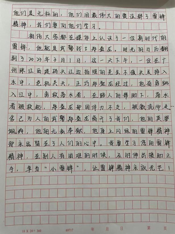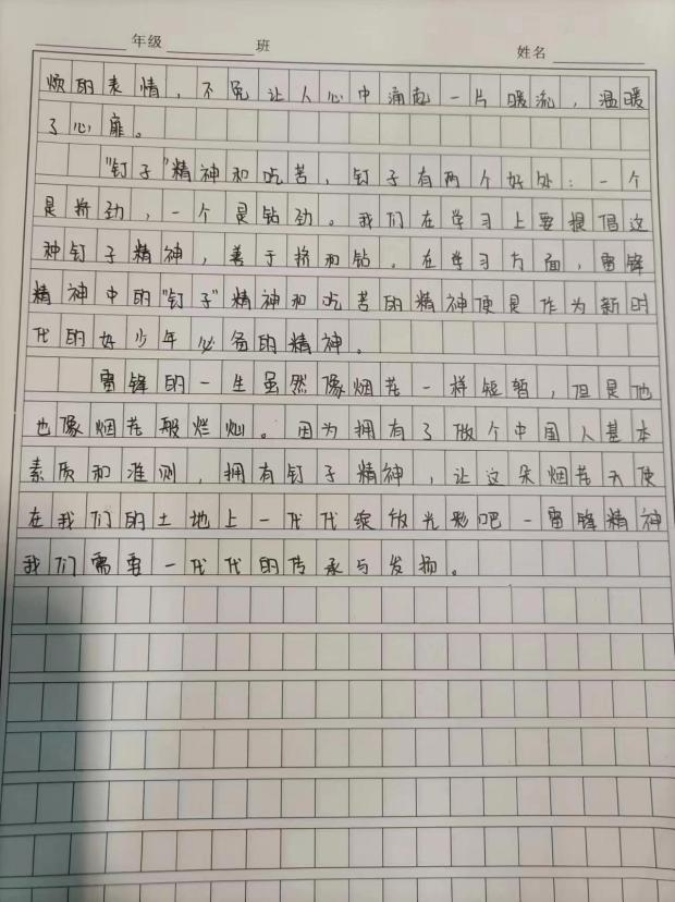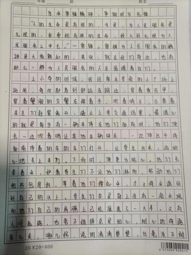 本次活动共收取征文121份,在上交的征文中,文章内容通过从雷锋精神起源、当代活雷锋的例子、全国道德模范中描写各行各业的先进人物的精神风貌以及身边的“学雷锋”故事,抒发自己的真实情感,学习并传承雷锋精神中乐于助人和奉献社会的精神,文章都表达出同学们争做新时代少年的积极性以及主动性,内容与实际相结合激励同学们争做新时代雷锋,传承新时代雷锋精神。