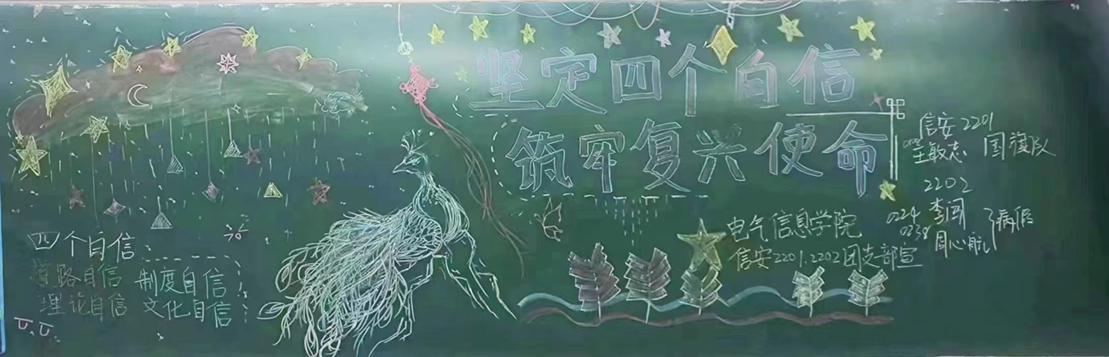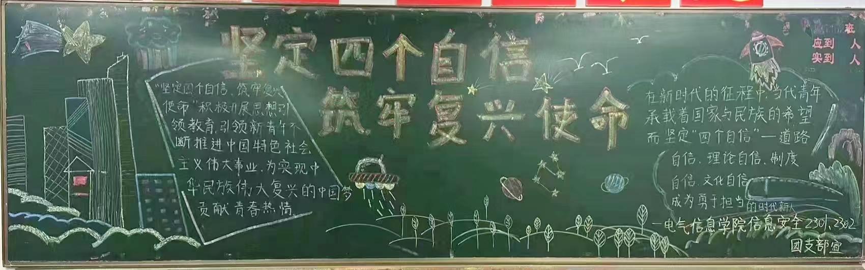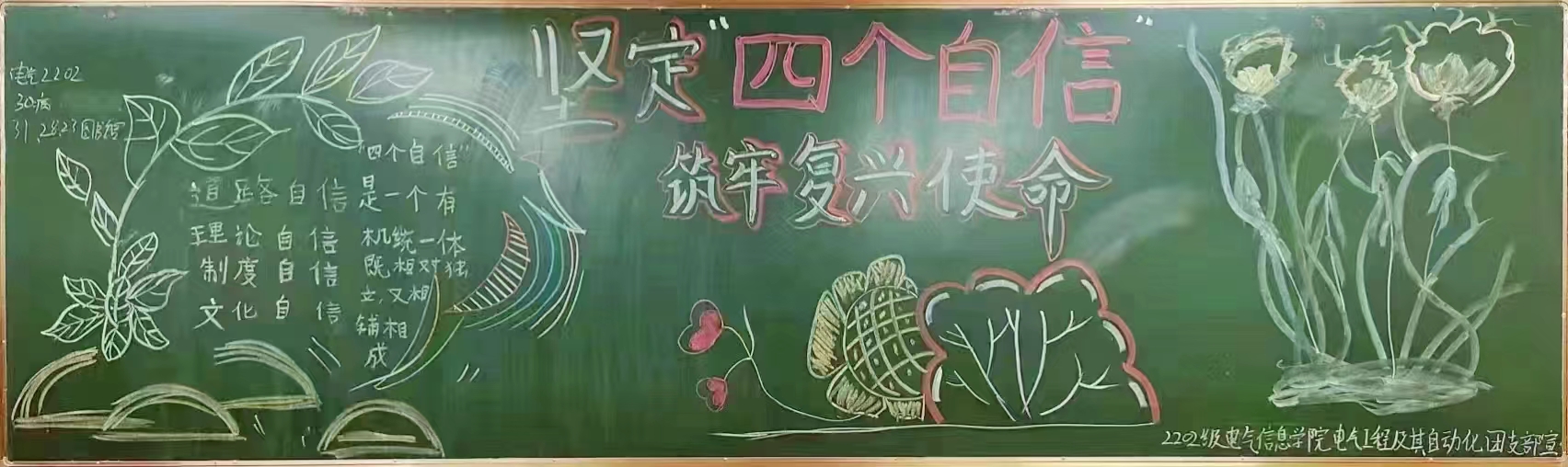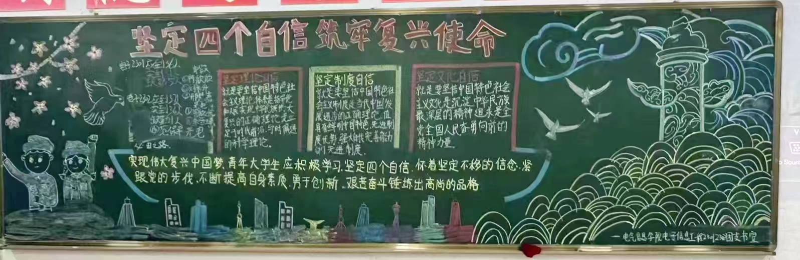 为充分发挥黑板报育人功能,营造积极向上的班级文化氛围,培养学生们的创新精神和审美能力,2024年3月27日19时,长春建筑学院电气信息学院开展以“坚定四个自信,筑牢复兴使命”为主题的第二期板报评比活动,22级、23级全体班级参加本次评比。