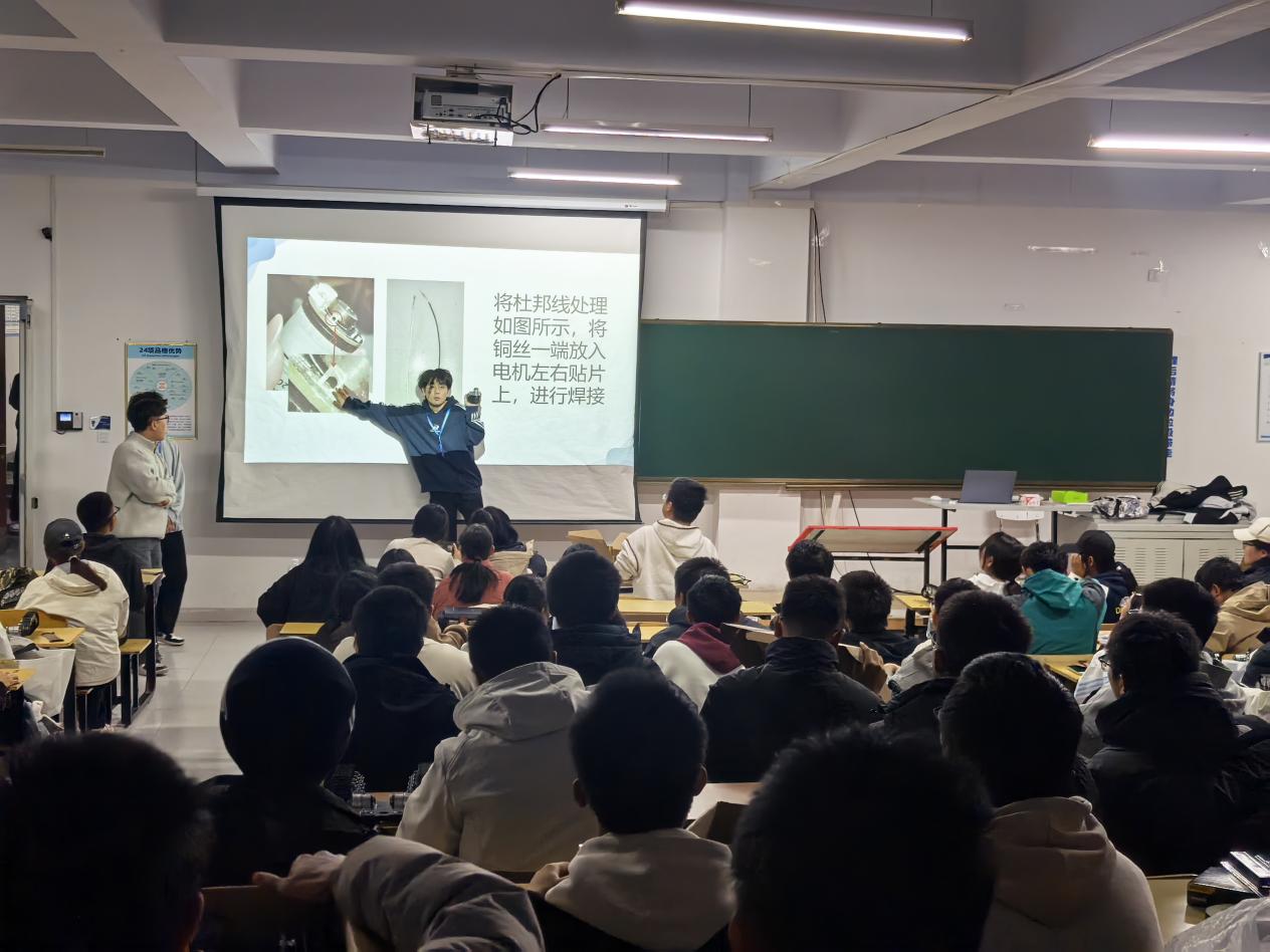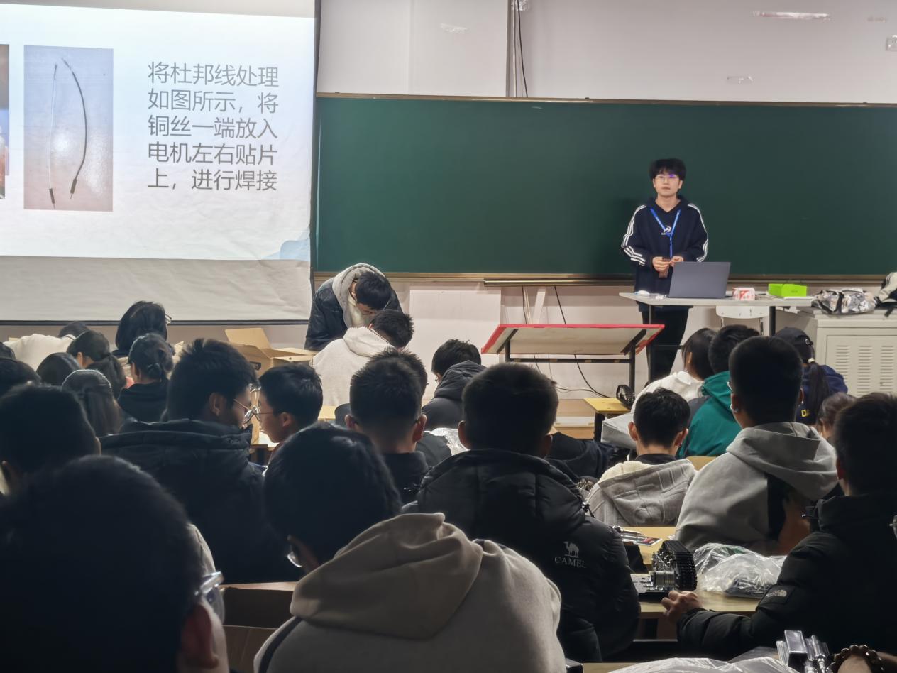 在随后的实操环节,同学们分组进行焊接练习,协会成员巡回指导,一对一纠正烙铁握持姿势、焊锡方法等问题,确保每位同学都能熟练掌握电机与开关的焊接技巧。此外,协会还在新生群中同步分享演示视频,多方位保障学习效果。整场活动氛围专注而融洽,展现了良好的协作与研学风气。