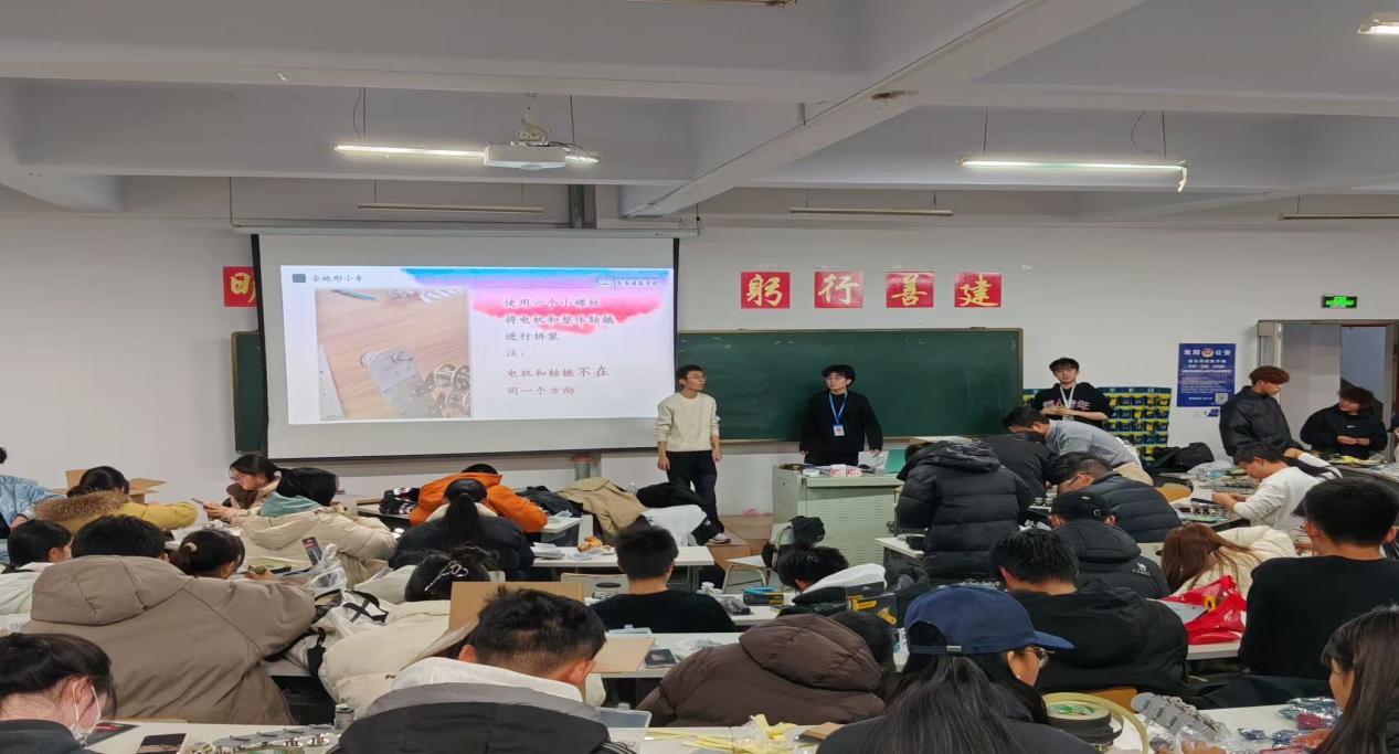 活动伊始,赛创合作交流协会会长登上讲台,结合配有详尽操作图示的PPT课件与提前录制的组装视频,围绕全地形小车零件的清点确认到整体拼装流程,展开了系统而细致的讲解。台上讲解条理清晰、重点突出;台下,赛创协会的多名成员穿梭于座位之间,为有疑问的同学提供一对一辅导,形成了“台上讲授+现场答疑”的高效互动模式。
