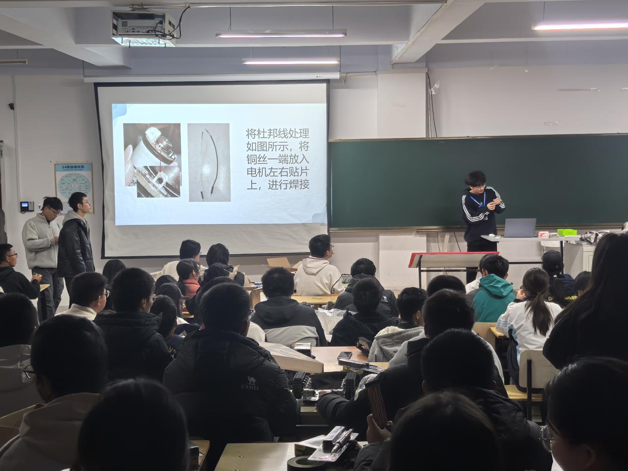 活动中,协会成员通过逻辑清晰的PPT讲解,系统介绍了焊接原理、工具使用规范及安全要点,并结合实操视频,逐步演示电机引脚定位、开关接线与焊点加固等关键步骤,帮助同学们迅速掌握焊接核心要领。主讲人重点强调了焊点质量、防虚焊与用电安全等细节,进一步强化规范意识。