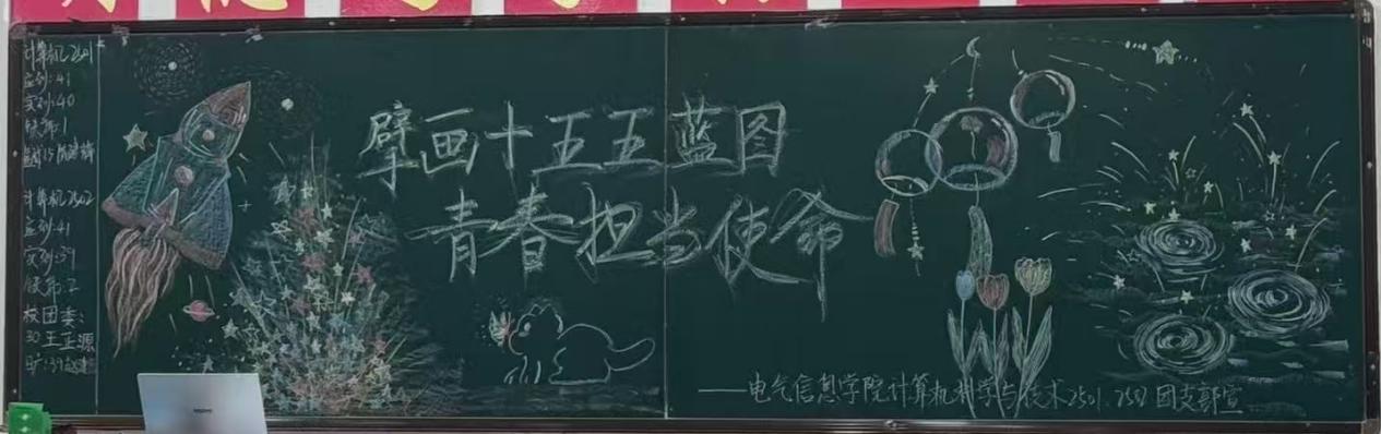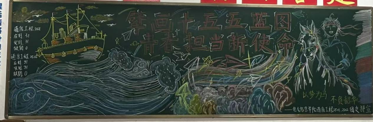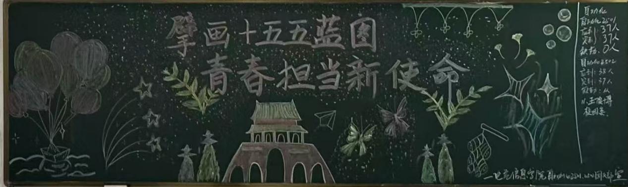 活动期间,各班同学群策群力、创意涌流,以黑板为画布,以色彩为笔墨,将“十五五”规划的发展愿景与青年学子的责任担当深度融合。最终呈现的板报作品主题鲜明、布局精巧、图文呼应、意蕴深厚,生动展现了学子们对时代蓝图的深刻理解与勇担新使命的青春决心。