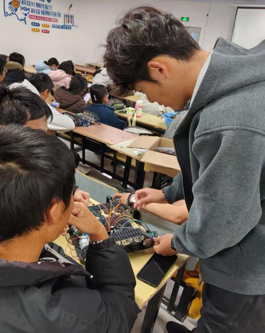 活动伊始,赛创协会成员率先梳理备赛过程中高频出现的技术问题,结合过往经验针对性讲解排查思路与解决方法。随后,成员们深入同学中间,采取“一对一”“一对多”相结合的辅导模式,直面同学们的实际困境。针对接线混乱、正负极接反等问题,成员们手持器材现场演示规范接线流程,细致讲解线路走向与接口对应技巧;遇到代码报错、逻辑混乱等情况,耐心剖析代码结构,修改调试关键指令;对于履带不动、电机不工作等硬件故障,大家共同拆解设备,排查电源连接、电机驱动等核心部件,手把手指导同学们完成故障修复。现场氛围热烈,同学们主动展示自己的机器设备,积极提出疑问,在赛创协会成员精准指导下,逐一攻克备赛难题。
