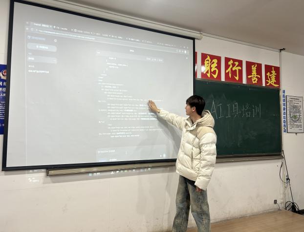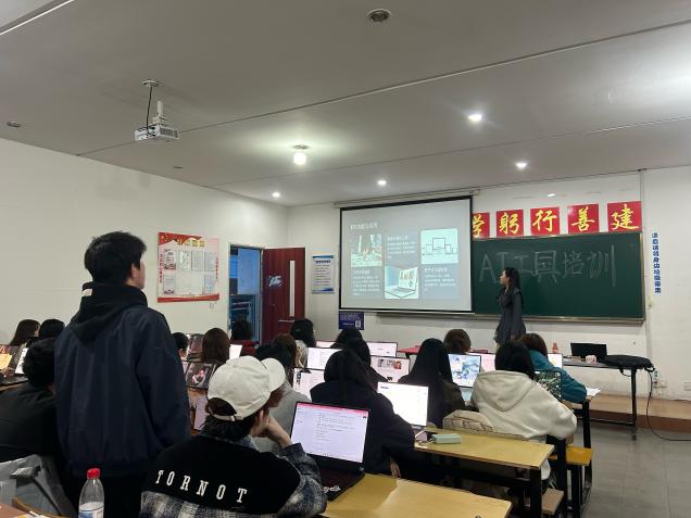 活动以理论讲解、实操演示、现场指导、互动答疑的形式展开,分专业、分教室有序进行。培训中,主讲人围绕豆包、WPS、Deepseek、Kimi、可画、堆友、海螺、即梦、可灵、飞书等多款主流AI工具,详细讲解软件功能、使用逻辑与实操技巧,结合课程学习、作业撰写、资料整理、专业研究等真实场景展示应用案例,让同学们清晰掌握AI工具的正确使用方法。